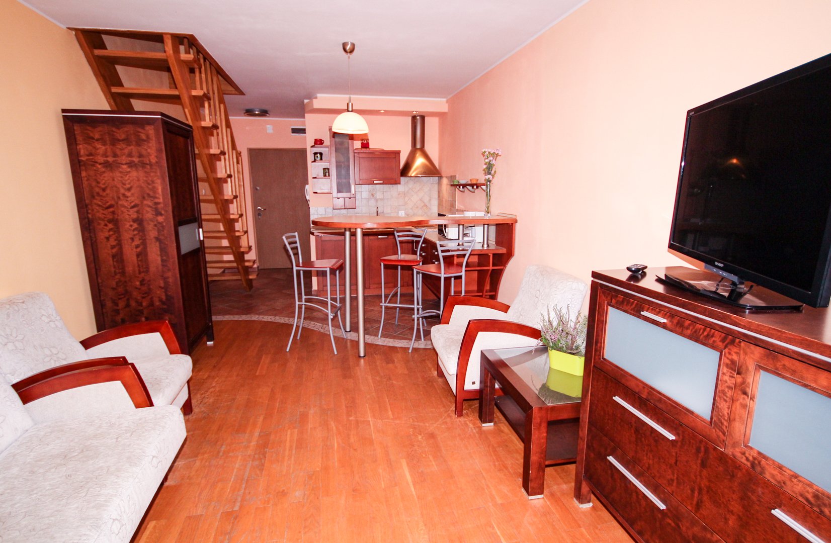 Dwupoziomowy apartament znajduje się na III piętrze ma całkowitą powierzchnię ok 40 m2, na którą składają się: - salon z kompletem wypoczynkowym (rozkładana kanapa do spania dla 2 os + 2 fotele), stolik, TV, balkon, - aneks kuchenny w pełni wyposażony - lodówka, płytka ceramiczna, czajnik bezprzewodowy, ekspres do kawy, garnki, naczynia, sztućce itp., - sypialnia na antresoli - duże łoże małżeńskie do spania + łazienka z natryskiem, umywalką, wc i PRALKĄ. Obok budynku na terenie posesji znajduje się indywidualne miejsce parkingowe z blokadą.