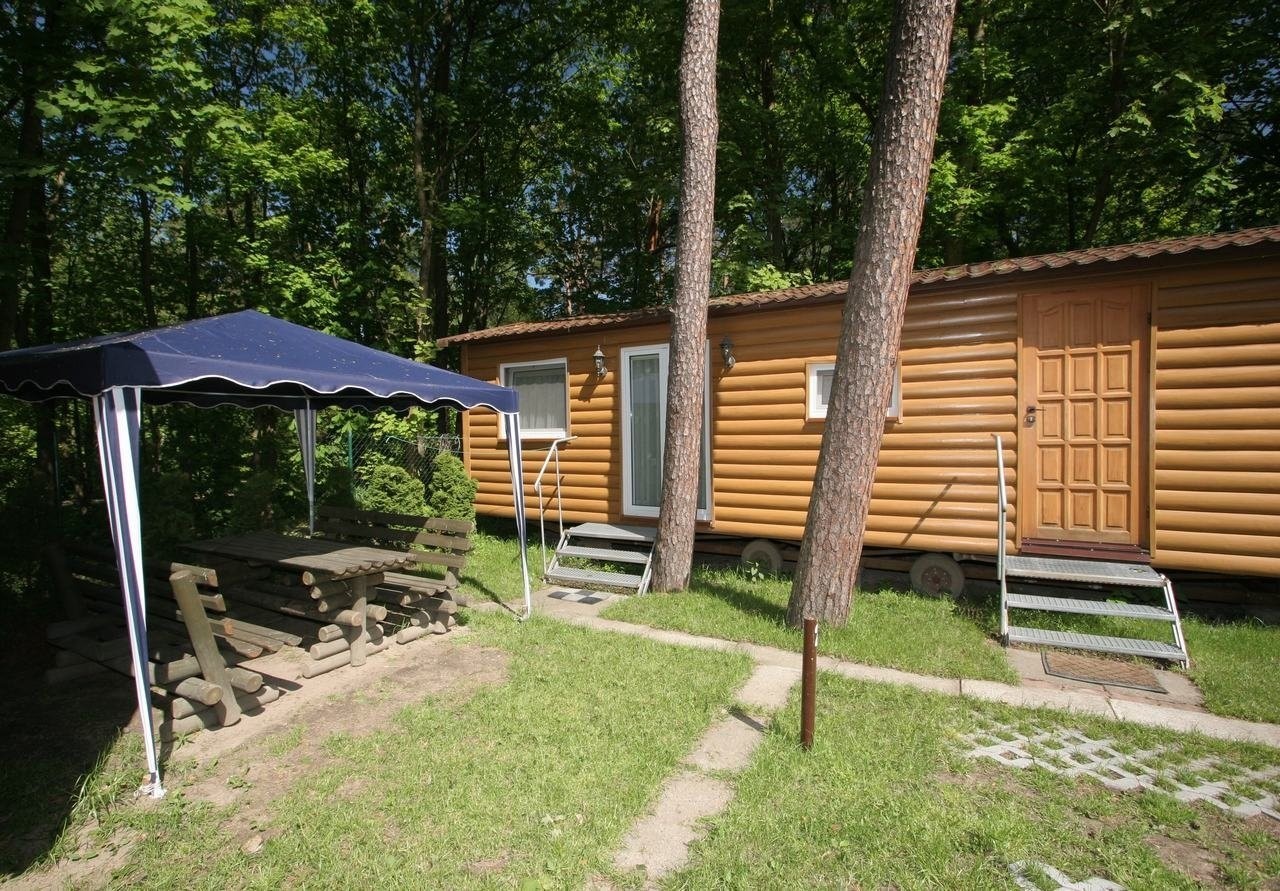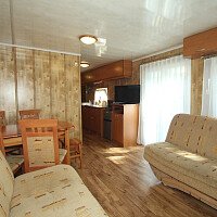 sypialnia: duże łoże (szer. 160 cm), TV 14 cali, szafa z wieszakami i półkami + szafa-słupek z półkami oraz biurko, - druga sypialnia z łóżkiem piętrowym + szafa-słupek z półkami - salon z dwoma kanapami, stół z krzesłami, TV-LCD, duże drzwi balkonowe, - aneks kuchenny w pełni wyposażony (lodówka, płytka ceramiczna, czajnik bezprzewodowy, garnki, naczynia, sztućce). - łazienka z natryskiem, umywalką i wc. Domek nr 4 jest większy o jeden pokoik z dwoma pojedynczymi łóżkami (bez możliwości zsunięcia).