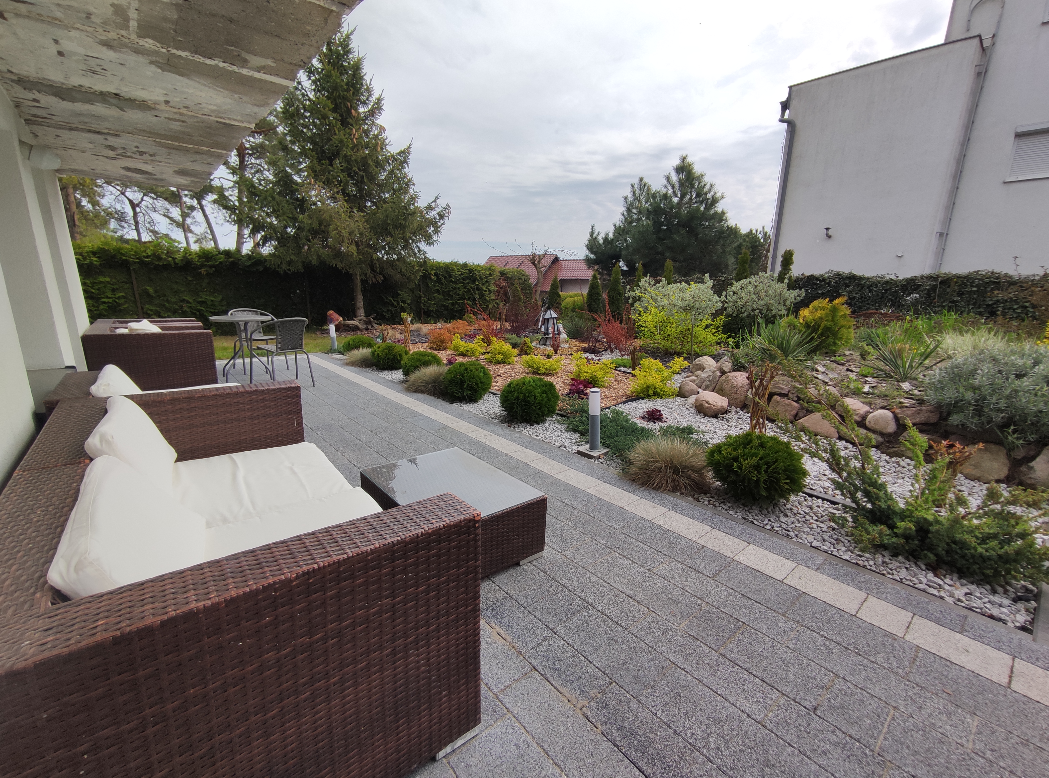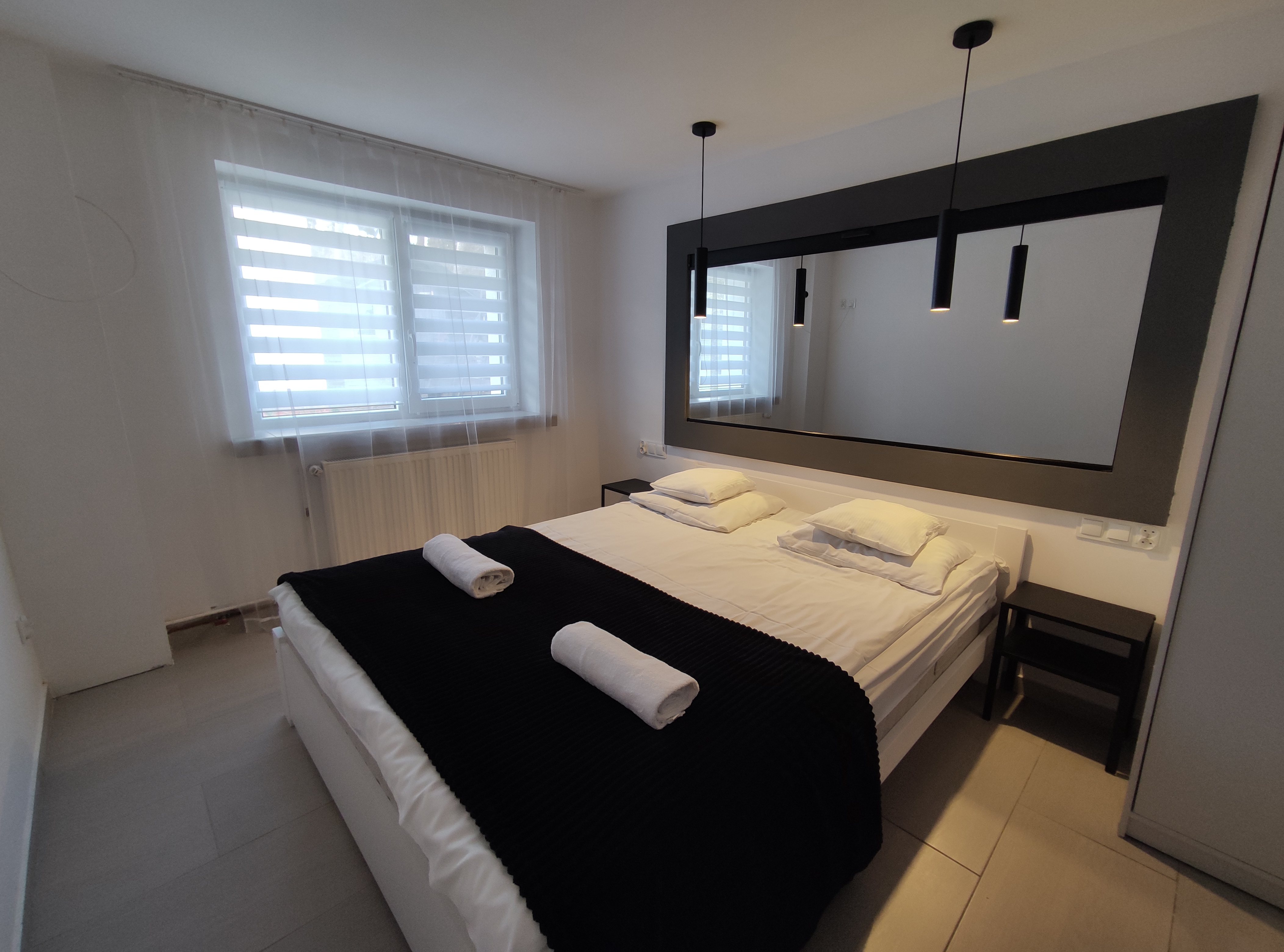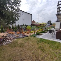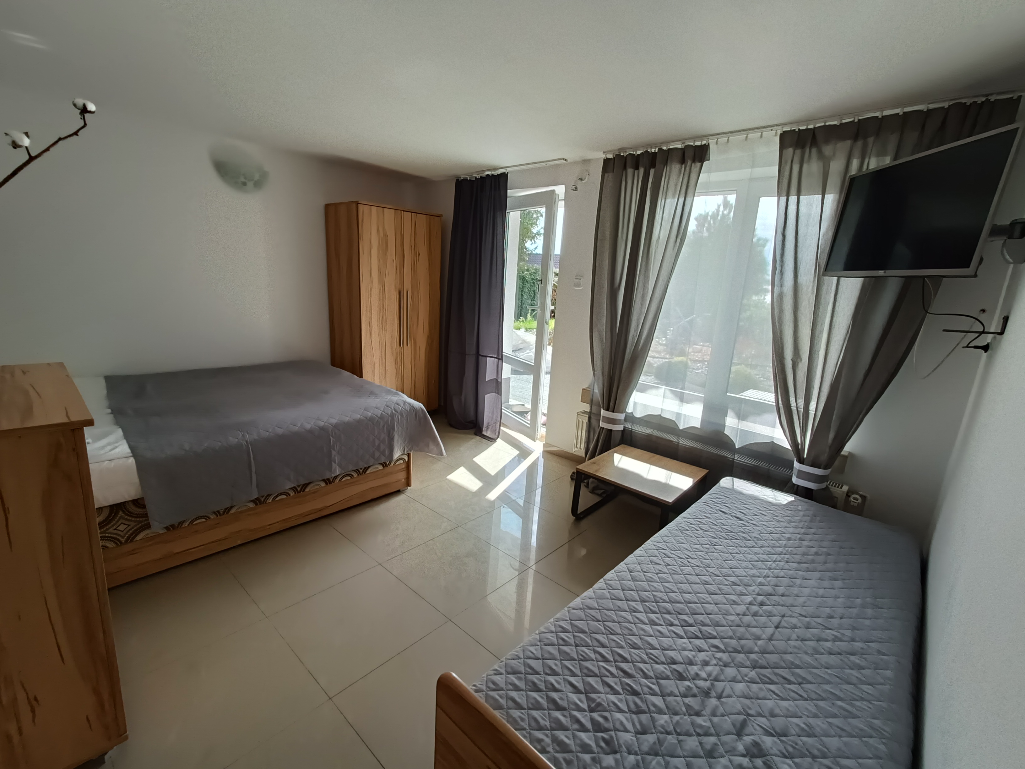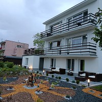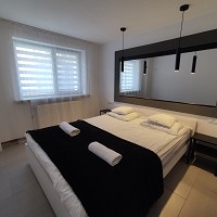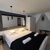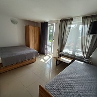 apartament znajduje się na parterze, z widokiem na ogród, ma dwie sypialni, kuchnia i łazienka. Przy pokoju znajdują się meble ogrodowe, na których można wypić poranna kawę
