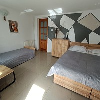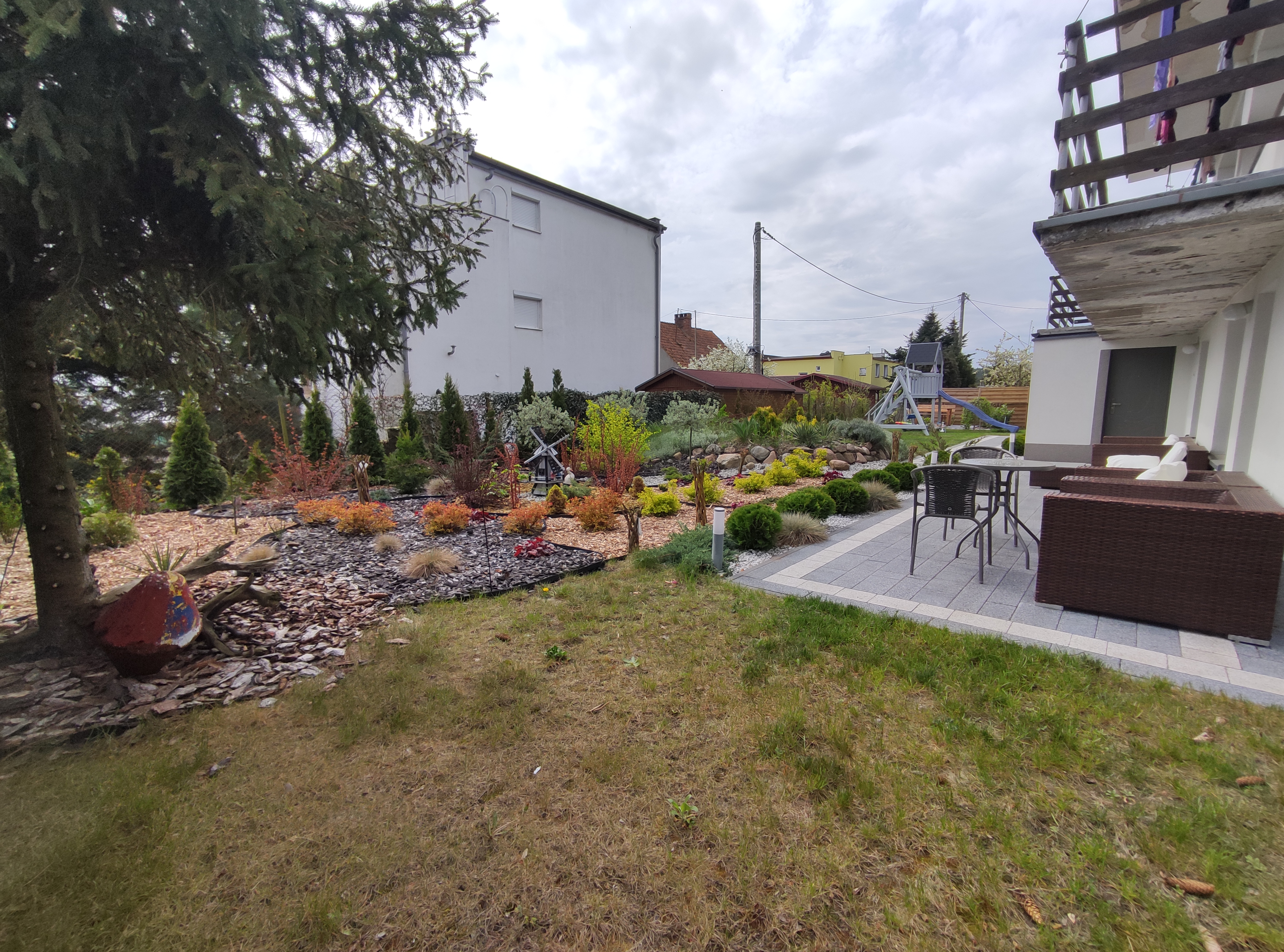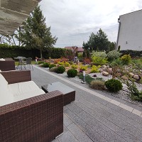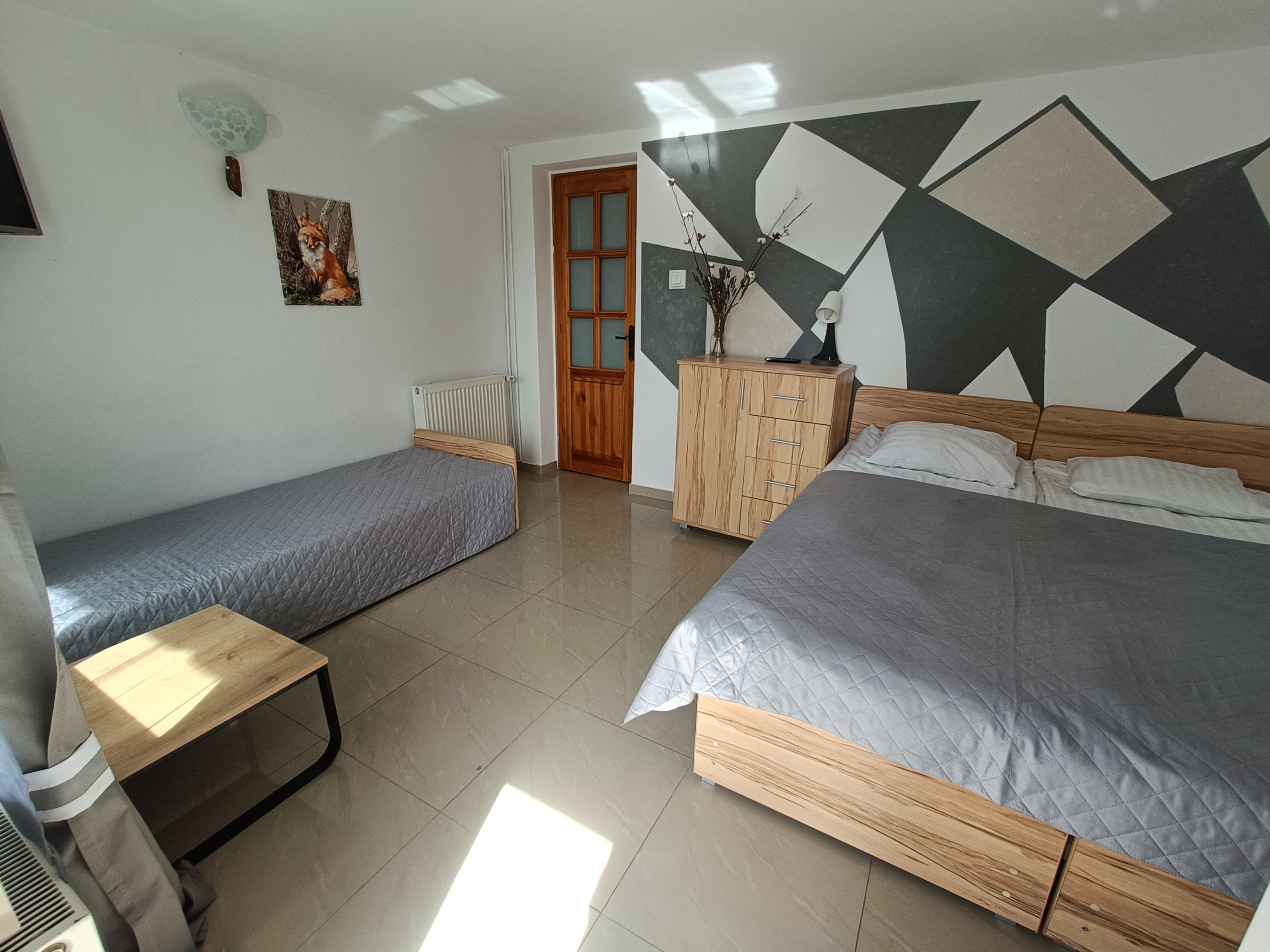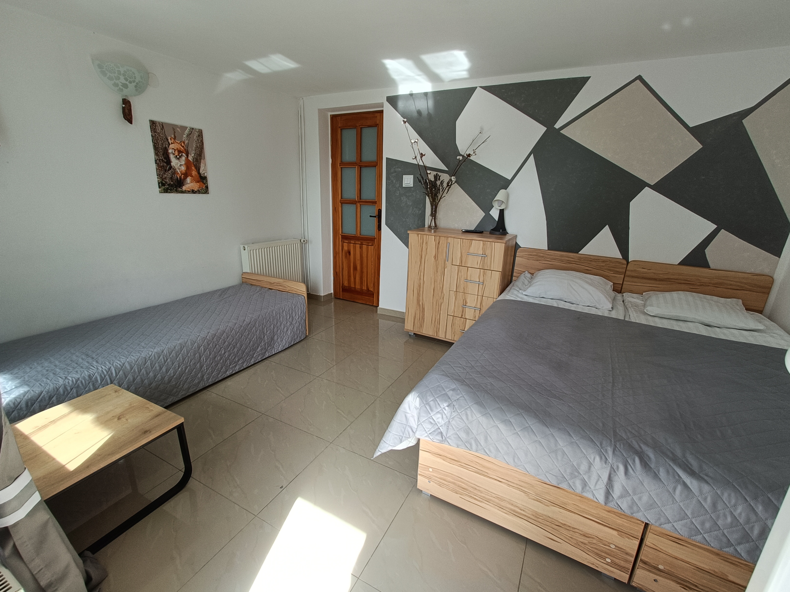 apartament znajduje się na parterze, z widokiem na ogród, ma dwie sypialni, kuchnia i łazienka. Przy pokoju znajdują się meble ogrodowe, na których można wypić poranna kawę